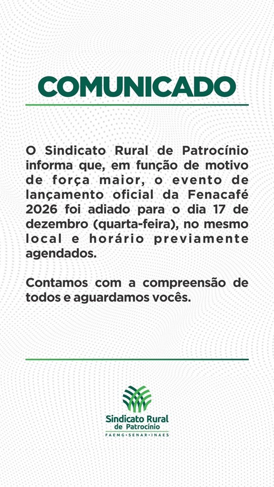 Na nota – veja abaixo -, o SRP informou que, “em função de motivo de força maior, o evento de lançamento oficial da Fenacafé 2026 foi adiado para o dia 17 de dezembro (quarta-feira), no mesmo local e horário previamente agendados. Contamos com a compreensão de todos e aguardamos vocês.”