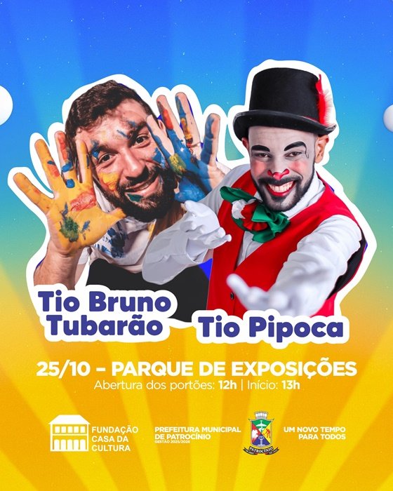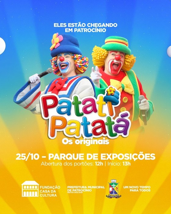 O ponto alto do evento é a presença da dupla mais famosa do universo infantil — Patati Patatá (Os Originais) — que traz todo o encanto e magia do seu espetáculo para o público de Patrocínio.