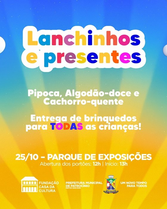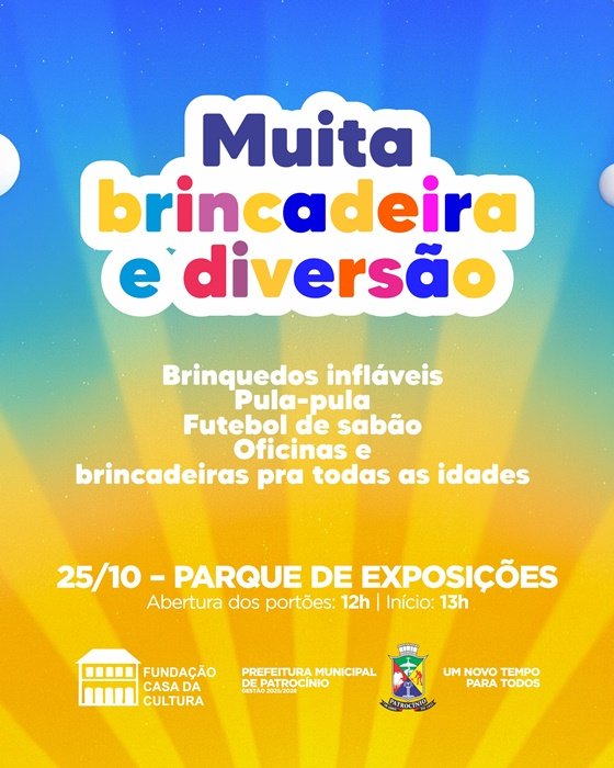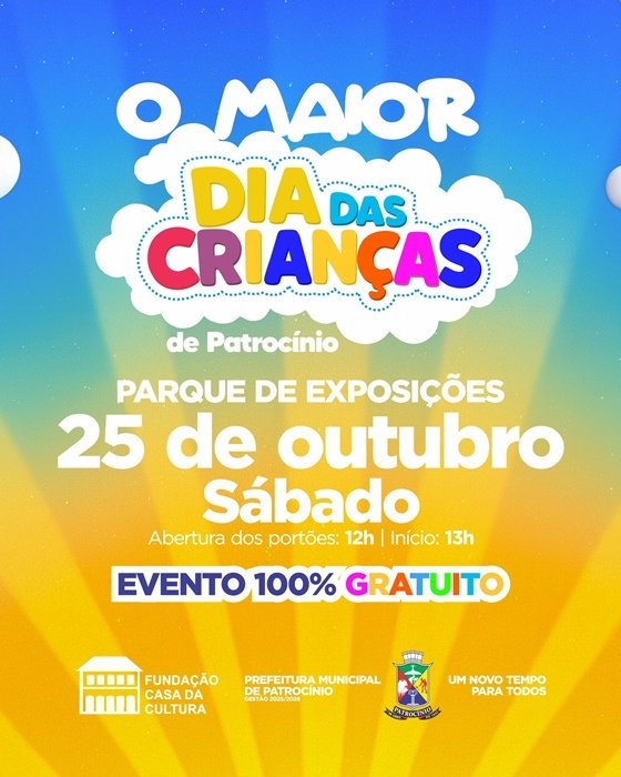 O Governo Municipal e a Fundação Casa da Cultura Dr. Odair de Oliveira, em parceria com as ACIP/CDL, realiza no dia 25 de outubro (sábado), o Maior Dia das Crianças de Patrocínio, um evento gratuito preparado com carinho para todas as famílias.