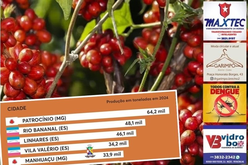 Patrocínio ocupa a primeira posição entre os municípios que mais produzem café no Brasil em 2024, conforme dados da Pesquisa Agrícola Municipal (PAM), com produção estimada em 64,2 mil toneladas.