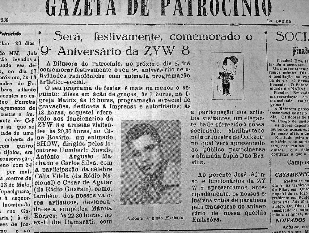 Com o título “Será, festivamente, comemorado o 9º Aniversário da ZYW 8”, a reportagem publicada na Gazeta de Patrocínio, assinada pelo jornalista Sebastião Eloi, descrevia com carinho cada momento da celebração. Era mais do que um aniversário: era um retrato vivo de uma época em que o rádio reunia famílias, aproximava vozes e transformava simples dias em acontecimentos memoráveis.