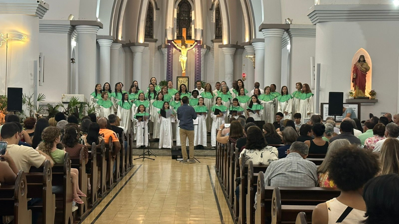 A noite final contou com uma emocionante Cantata de Natal do Coral Patrocínio Encanto, regido pelo maestro Valter Pires, realizada no interior da Igreja Santa Luzia.