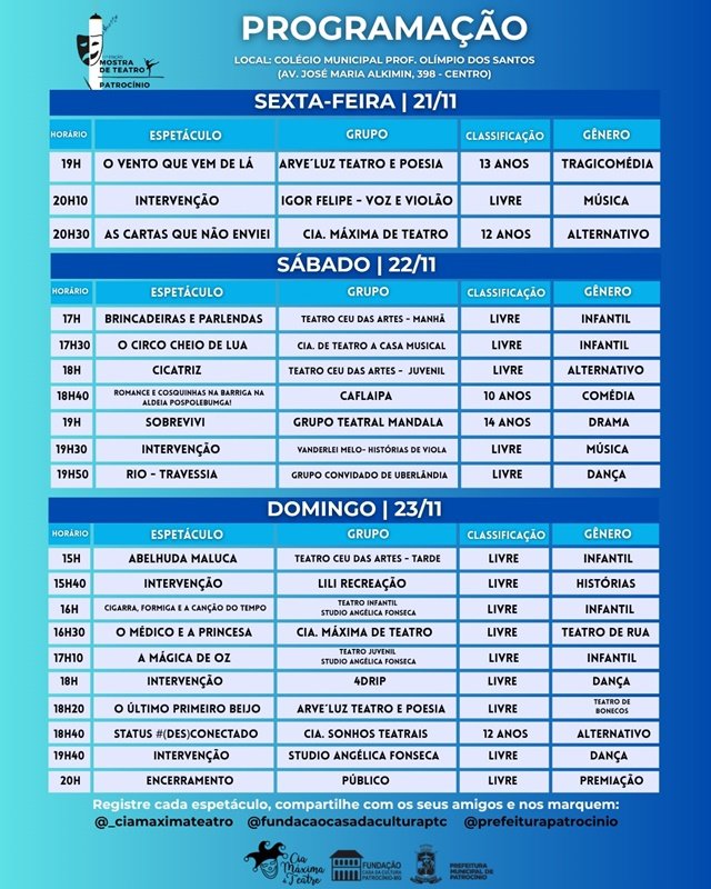 Patrocínio se prepara para receber, entre os dias 21 e 23 de novembro, a XI Mostra de Teatro, um dos eventos culturais mais tradicionais da cidade.
